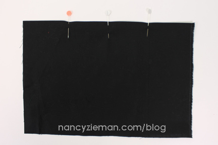 Using the 10″ x 10″ fabric and interfacing rectangles, pin the smooth side of the interfacing on the right side of the fabric. Make two pair; one bright strata and one neutral strata.