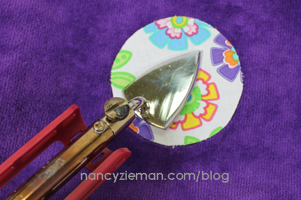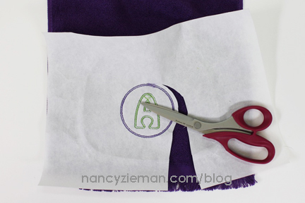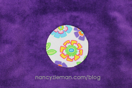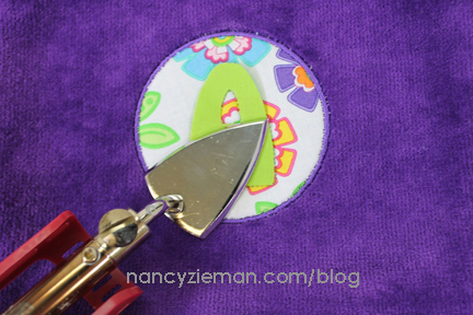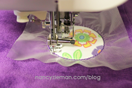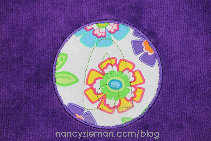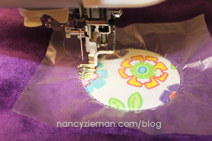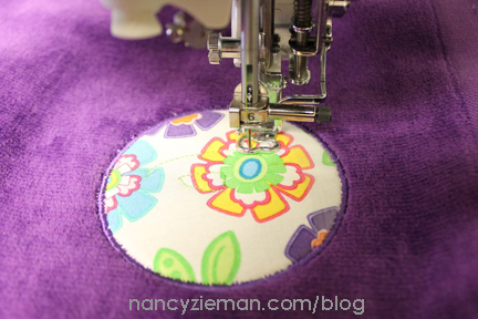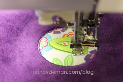 Notice in the photo I used an open toe foot and a narrow blanket stitch to stitch the circle to the background. Each point takes a small dip into the circle itself. Choose a blanket stitch, decorative stitch, or straight stitch to apply the shapes.