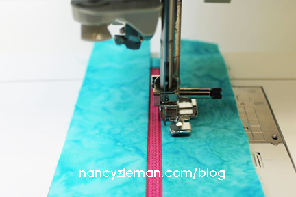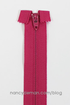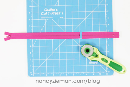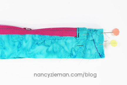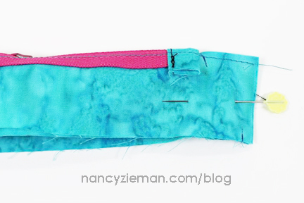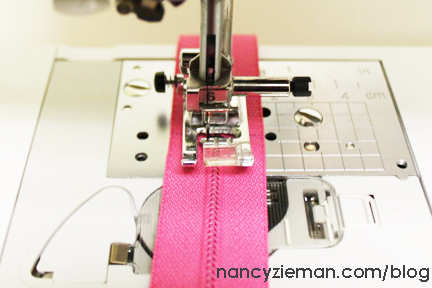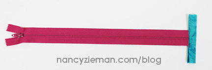 Use a wide zigzag stitch, with a zero stitch length, to bartack over the zipper teeth at the cut end.