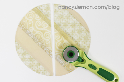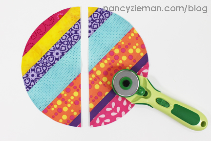 From each bright and neutral fabric strata cut one 10″ x 10″ fabric square (for circles).