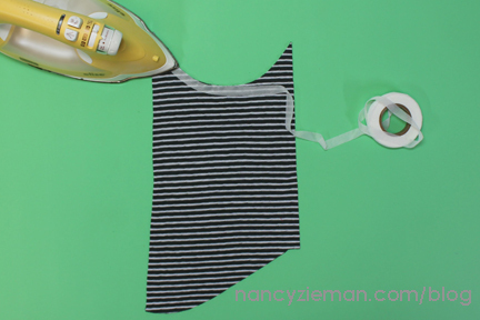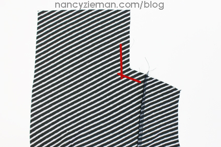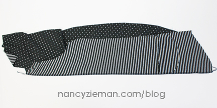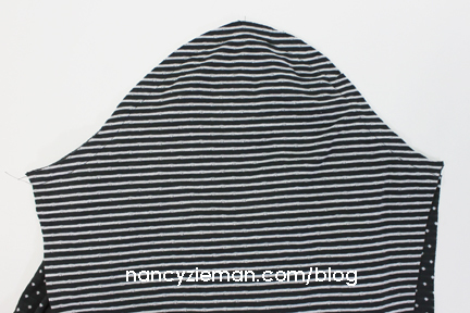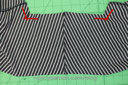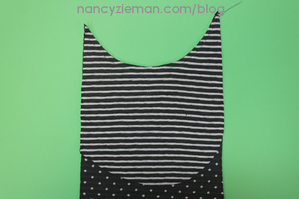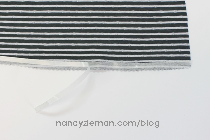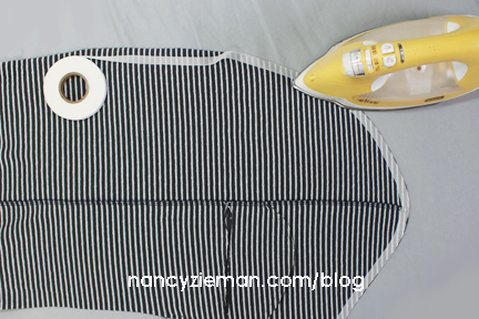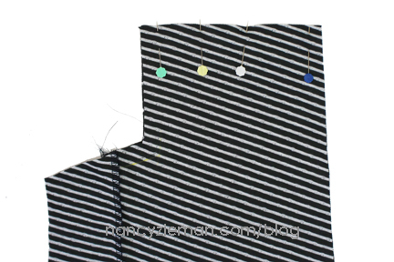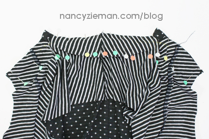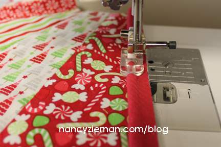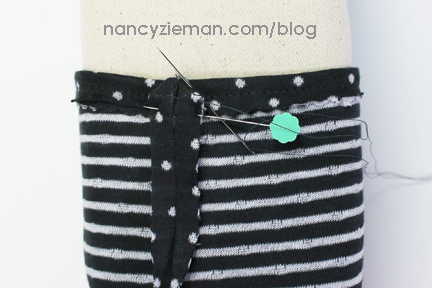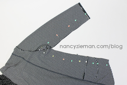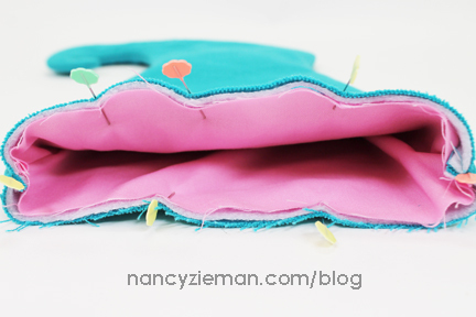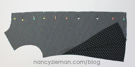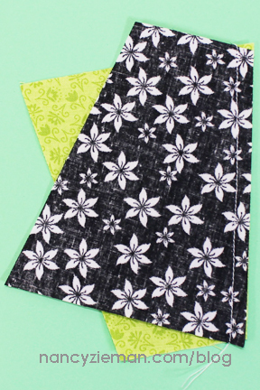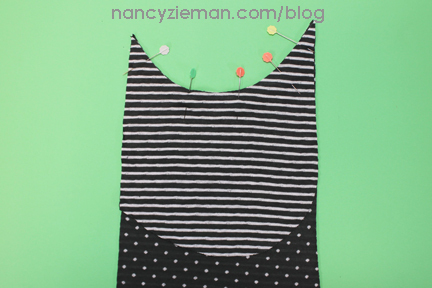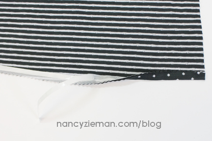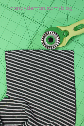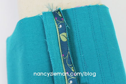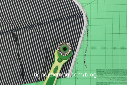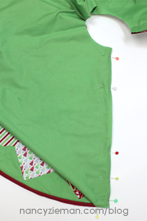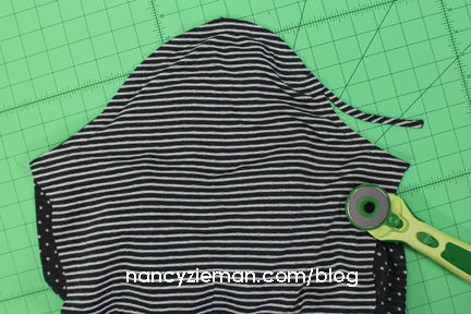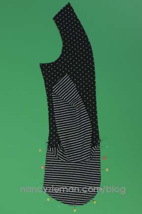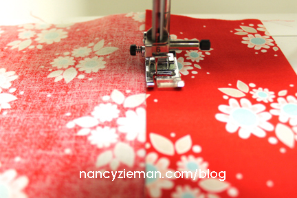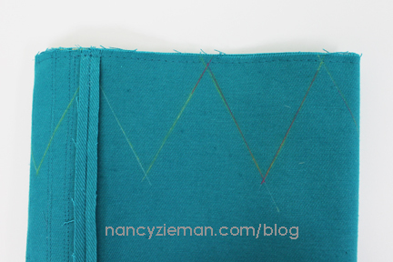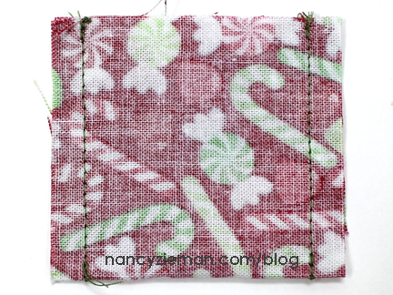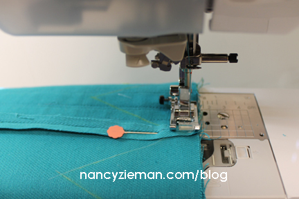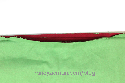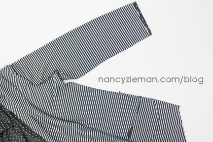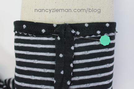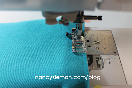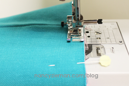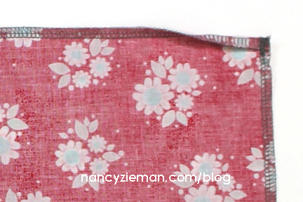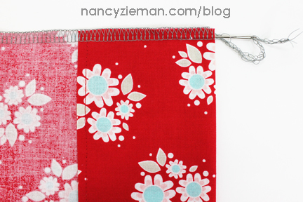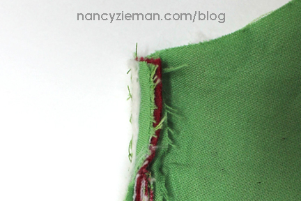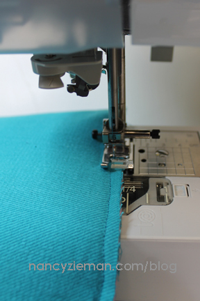 Note from Nancy: A straight stitch with a 1/4″ seam allowance and zigzag stitch to secure the seam can be used in place of the serger.