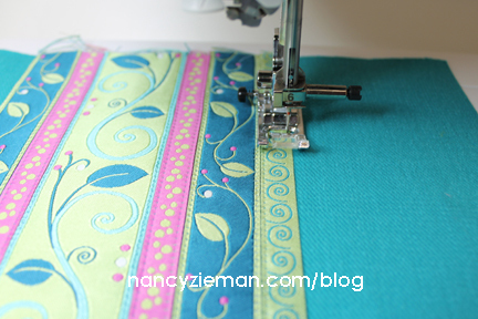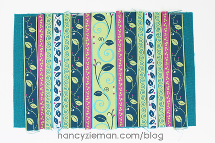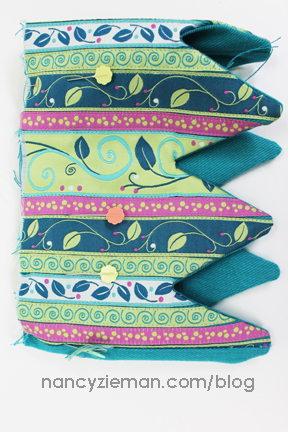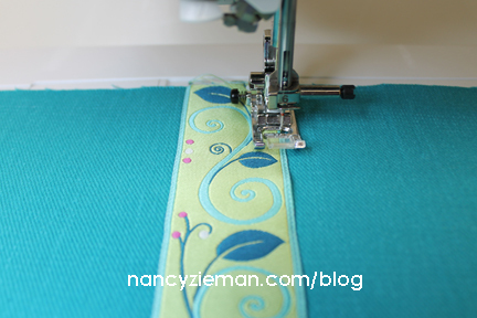 Continue to add ribbons to the right and left, edgestitching at both sides of each ribbon.