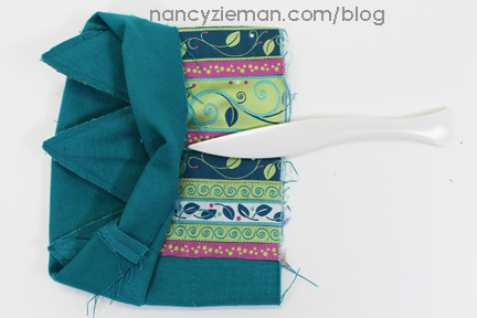 Fold or “wrap” the seam allowance forward and serge the long edge of the pillow.