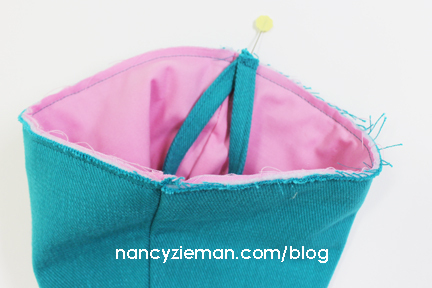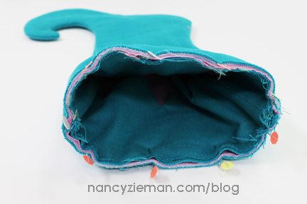 Baste the hanging loop inside the stocking along the back. Note that the loop is pointing down, opposite of how it will be used.