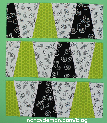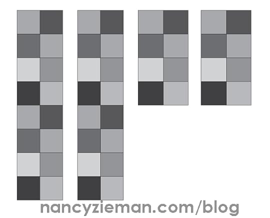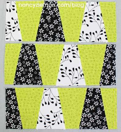 Set your stitch length to a short stitch—around 1.5 or so. Alternate your fabrics in medium and dark tones, and sew into two sets of four stacked strips. Use 1/4″ seam allowances.
