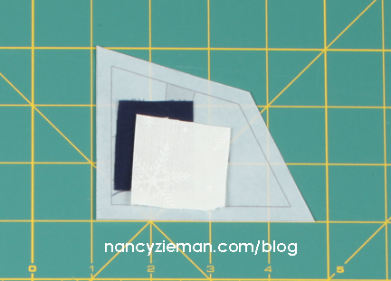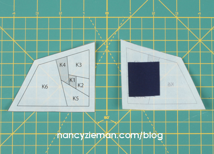 Working from the back of the translucent paper , place your first piece of fabric, right side up, into the K1 spot. Glue the wrong side of the fabric to the back/unprinted side of the foundation paper. There should be at least 1/4″ of fabric seam allowance extending over the marks where the seamlines will be for piece #K1.