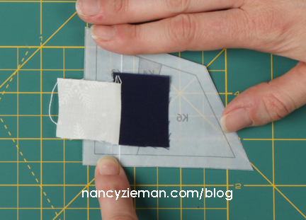 Trim a rectangle of blue fabric that clears the first “K1″ space with at least 1/4″ around all sides. Be sure to give yourself extra to make sure it will have an adequate seam allowance.
