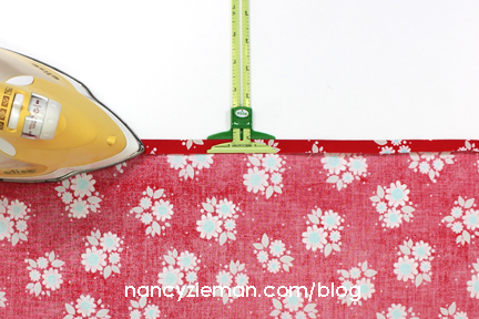Along one 30″ edge, press under 1/4″ towards the fabric’s wrong side.