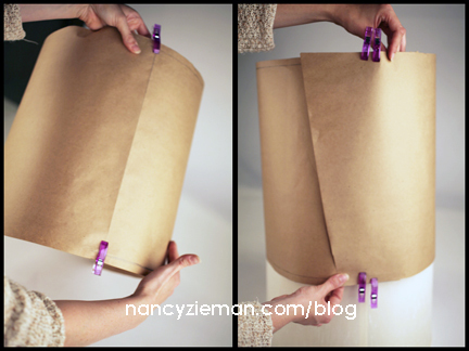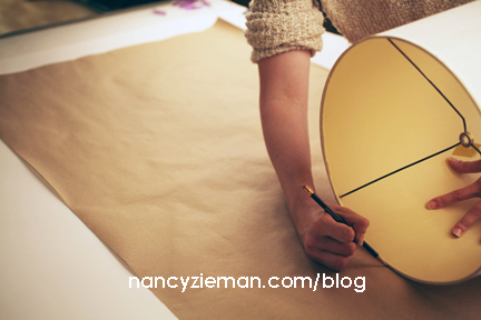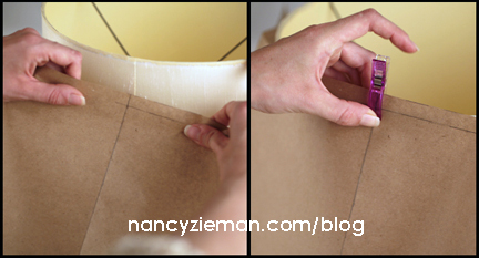 Center your lampshade over the kraft paper with the seam down—you’ll want the seam to be going as perpendicular to the top and bottom of the kraft paper as possible.
