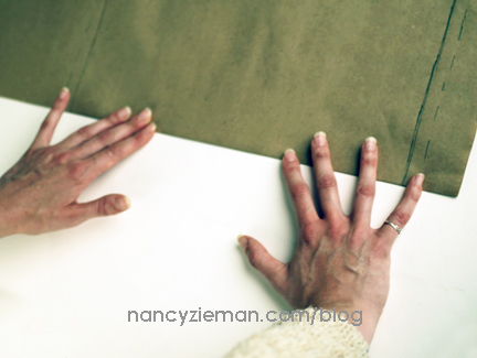 Open your pattern up and center the foldline over the seamline of the shade. Clip at seamline, top and bottom Note: I folded over the extra 1/2″ allowance.