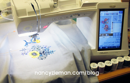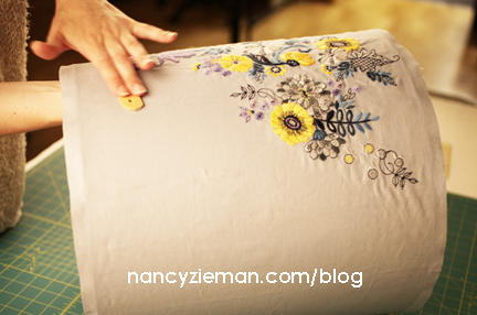 Embroider your designs where you’d like them. Note: I concentrated mine at the front of the shade, which falls in the middle of your pattern.