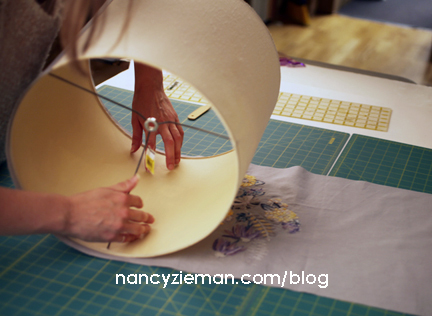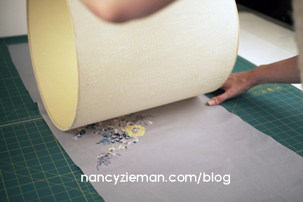 Now comes the fun part: adhering the fabric to your shade. The embroidered fabric should be lying face down on your table, flat.