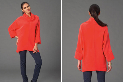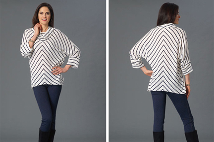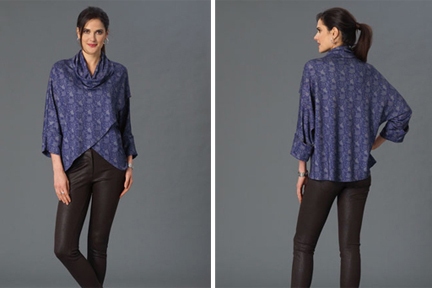 Review: In options A and B, styles feature differing hem lengths, which make this top excellent to wear with tights, jeans or skirts. The styles are also drafted for sewing machine stitching or serger construction. Shown in style C, the top has an asymmetrical wrap across the body. The pullover is a truly versatile piece.