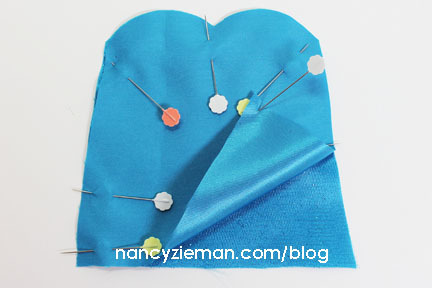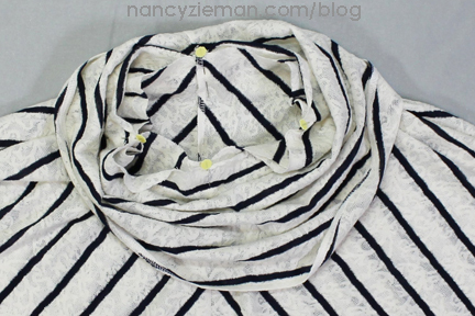 Quarter-mark the neckline of the collar and neckline of the top. To quarter-mark, fold the opening in half and in half again, placing a pin at each of the four folds.