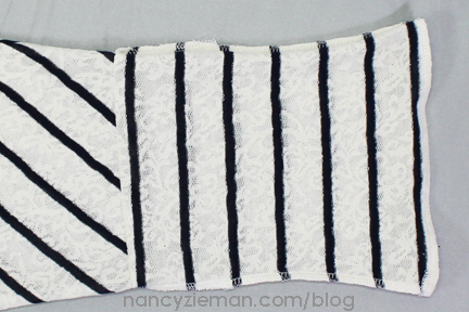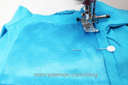 Turn up a 1/4″ hem to the wrong side, folding the lower edges of the sequin and lining fabric together; topstitch.
