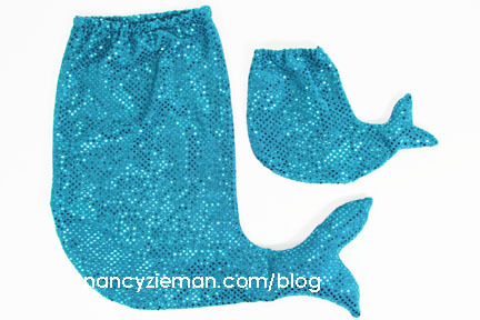 Here’s a sewing tutorial on how to create a mermaid tail in time for Halloween or for dress-up all-year long. The idea came from my granddaughers. After watching Doll Costume Dress Up on Sewing With Nancy, my oldest granddaughter Avery promptly asked, “Gramma, for my birthday could you make a mermaid costume for my doll and one for me too? Now, don’t make an opening for my feet, I can swim like a mermaid with a tail!” Then I asked her sister, Luella what she would like for her birthday. Answer: “Same as Avery!” So, two mermaid sets–big and small–were the task. (Much to Avery’s dismay, I made the big-girl fish tails with openings for feet!)