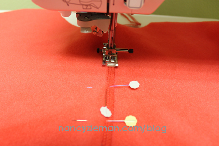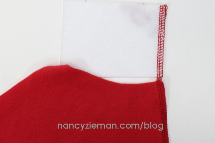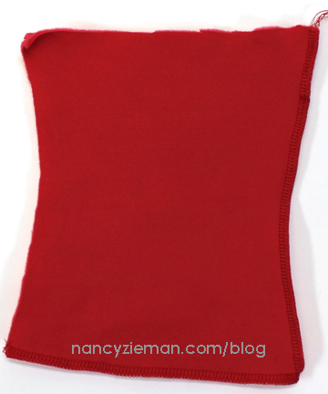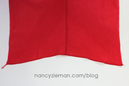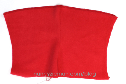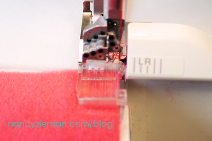 Note from Nancy: When serging fleece or other thick knit fabrics, beginning serging on an “anchor cloth,” an extra piece of fabric. Align the project fabric next to this starter fabric and proceed to serge the edge or seam. Later, clip off the anchor cloth and save it for the next seam. This little tip assures that the beginning of the seam or edges have perfectly even stitches.