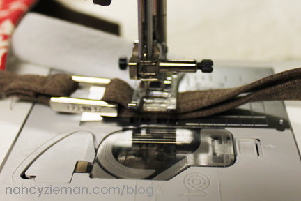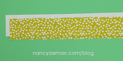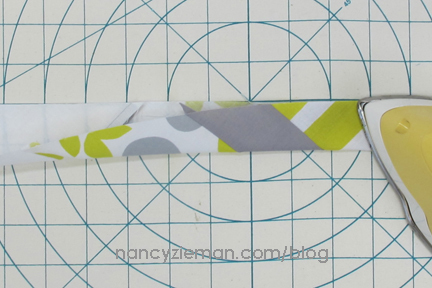 Cut 1-1/2″ wide crosswise strips of an accent fabric. Insert fabric strip through the wide end of a 3/4″ bias tape maker; press.