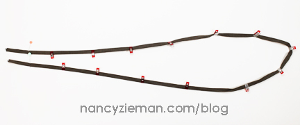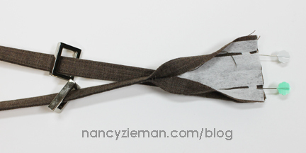 Place double straps on the end of an ironing board. Pin layers together 1-1/2″ on each side of the center mark.
