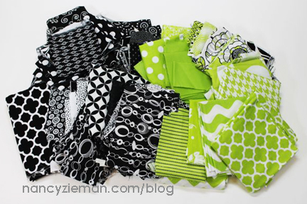 Throughout this adventure, I am working in a scrappy palette of three colors. Any three colors should work. I’ll be working with black, white, and a green/chartreuse color collection. As I rummaged through my quilting fabric scraps, I found that I had the most of these colors on hand.