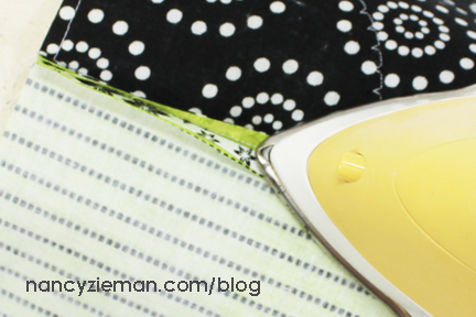 Note from Nancy: There are two options when pressing seams: Press the seams open or press both seams to one side. Due to the number of layers of fabric, I prefer to press the seams open for this scrappy block.