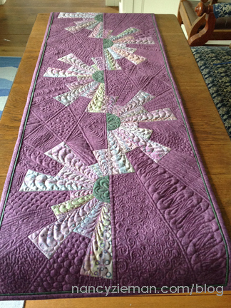 Here’s another project from Diane Ahnstedt. She used the project/pattern sheet, Dresden Melody, to create a dynamic table runner. The multi-size Dresdens twist and turn through the project to add movement to this contemporary block design.