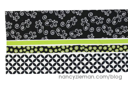 Let’s get started on the quilt adventure by choosing fabrics. I recommend choosing three colors. Any three colors should work. I’ll be working with black, white, and a green/chartreuse color collection. As I rummaged through my quilting fabric scraps, I found that I had the most of these colors on hand.