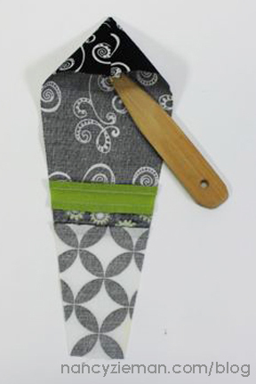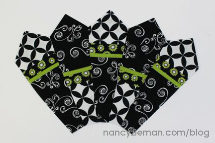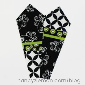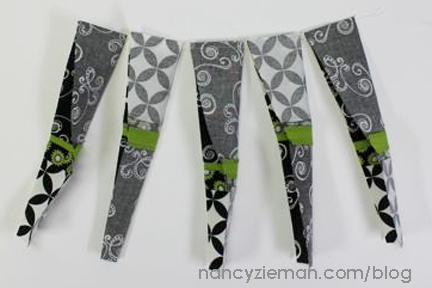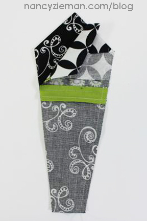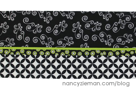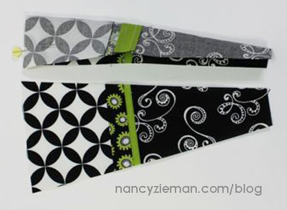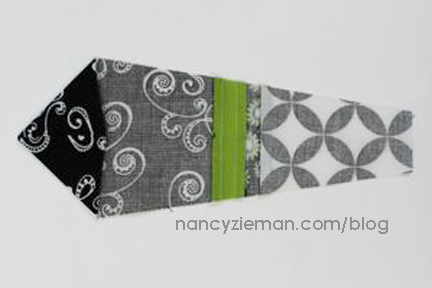 Cut a 1-1/4″ x 17″ strip black/green/white print fabric.