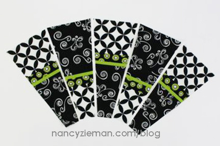 Follow the directions included with the Trace ‘n Create Dresden Template, select the wedge size desired, and trace five wedges per block.