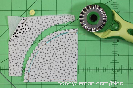 Remove the excess fabric, 1/4″ past the stitching line, using the Pinking Rotary Cutter .
