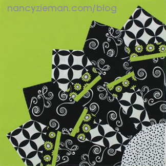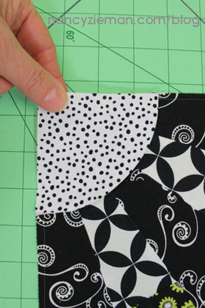 Place finished quarter circle on the lower corner of the Scrappy Dresden block.