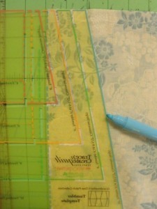 Stack several cut strips of fabric. Begin by aligning the die-cut area of the Finishing Piece at the narrow end of the strip. Trace along the die-cut area; in this case I’m using the largest size so the tracing is at the edge of the template.