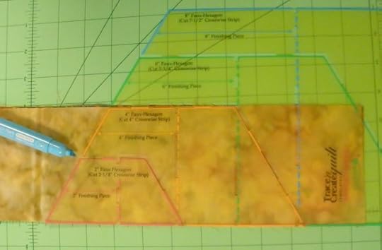 Cut strips of fabric the width printed on the template, trace the edges, rotate the template, and trace some more. There are even finishing pieces to trace, squaring the traditional hexagon-shaped edges. Oh, it’s easy to sew!