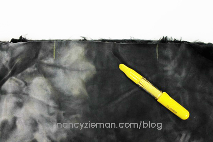 Cut on marked lines with the tip of the scissors, cutting only the backing, not the fur. Cutting faux fur in the traditional manner leaves you with a complete mess of fur! If you happen to cut the fur, simply use a vacuum with hose attachment to help with the clean up!