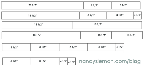 Using a rotary cutter, mat and ruler, cut two sets of 6″ squares, cut two sets of 5″ squares, cut two sets of 4″ squares, cut two sets of 3″ squares, and cut three sets of 2″ squares.