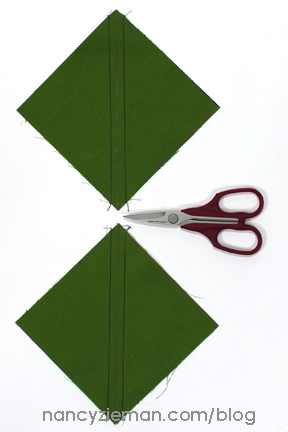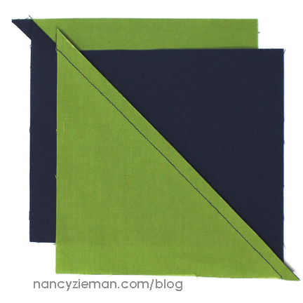 Press four squares in half, diagonally corner to corner, wrong sides together, and aligning raw edges. Press.