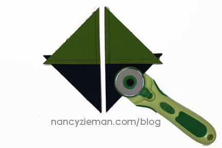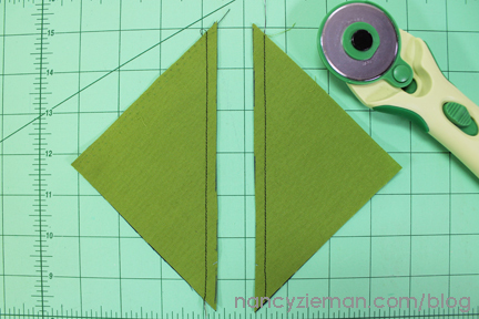 If you’re using fat quarters for the background fabric strips, cut two each crosswise fabric strips and later stitch folded triangles in center seams (see step 6) when joining strips.