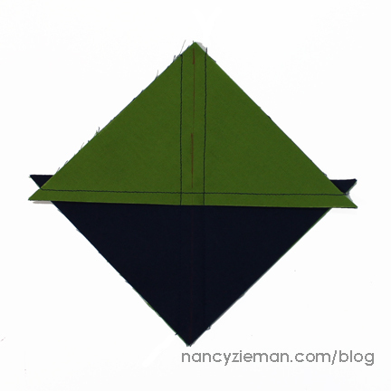 Stack a second folded fabric triangle over the first triangle, and align lower and right edges.