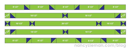 Column 1: Center and pin the 4″ Folded Triangles facing down on the 4-1/2″ background strip, as shown. Insert two each fabrics A-D folded triangles.