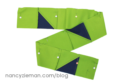 Fold the strip right sides together at each Floating Triangle. The Floating Triangle is sandwiched between the fabric.