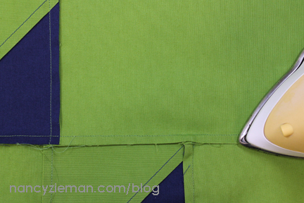 Stitch 1/4″ from the fold. Repeat at each Floating Triangle; press the strip.