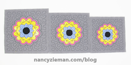 On the design CD included in the new Quilt with an Embroidery Machine in 8 Easy Lessons book, you’ll have the option to create projects in a variety of sizes including 6″, 7″, or 8″ quilt blocks. Choose a size that best suits your project dimensions.