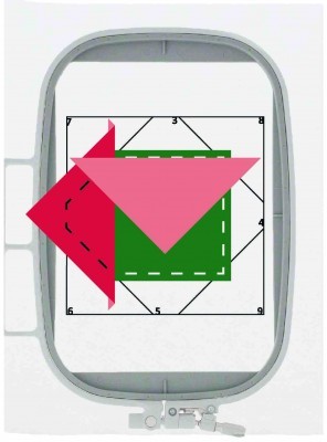Use Nancy Ziemans “Wrapped Corner” technique to “wrap” to seam toward center, folding along previous stitching line. Use The Big Jig or and “anchor cloth” and stitch the this third seam – from folded edge to folded edge.