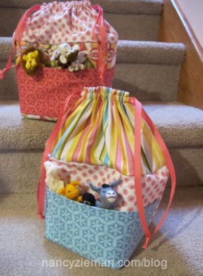 If you’d like a taller top closure like the activity bag pictured below (front), purchase three fat quarters plus 1/3 yard of a fourth coordinating fabric, in this instance, the yellow striped fabric.
