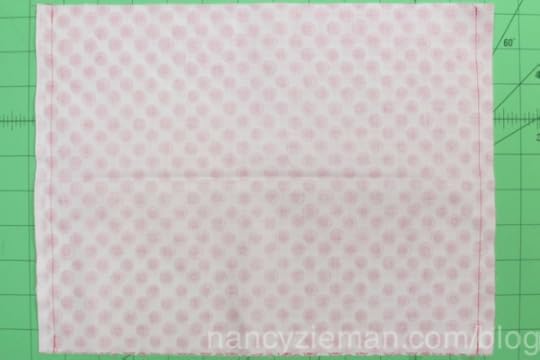 Place two inner/lining lower bag rectangles right sides together. Pin at lower edge. Stitch with 1/2″ seam allowance. Press seam open.