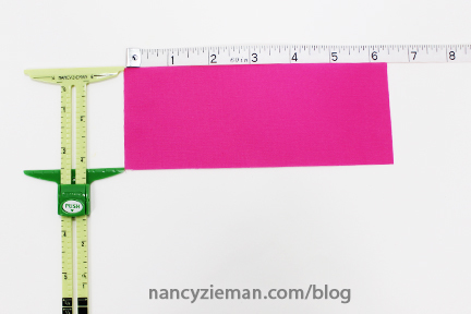 Cut strips the size printed on the gauge. Then cut strips into squares. In this example, cut 6-1/4″ strips, then cut strips into 6-1/4″ squares.