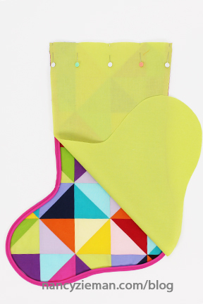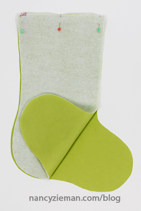 When joining the stocking, leave a 4″ unstitched opening along the lining straight edge. As a reminder to stop stitching at this area, place a pin parallel to the cut edge, rather than perpendicular.Stitch around the stocking using a 1/4″ seam allowance.