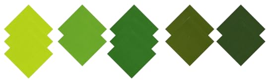 Cut twelve 5″ fabric squares from five different assorted green fabrics.