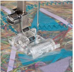For smooth sailing over varied thicknesses of fabric, stitching napped fabrics, and sewing on tacky surfaces, use the Roller Foot. See it in action gliding over fabric, alleviating the “pushing” on the underside of the foot as the feed dogs “bite” the fabric. The Roller Foot also works great when making Thread & Trim Pizza. Tune in to learn the recipe.