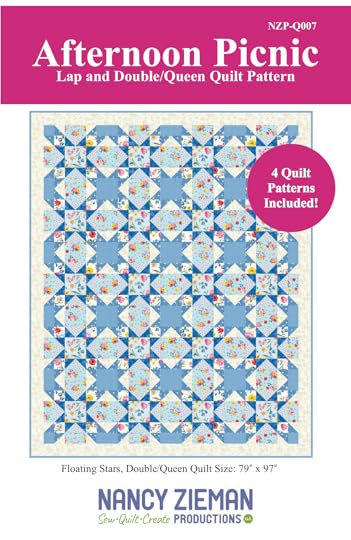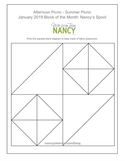 Each month, we will feature one block design. The blocks are created using Nancy Zieman’s NEW! Afternoon Picnic Fat Quarter Pack from Riley Blake Designs * (18″ x 22″ fabric rectangles) plus border fabrics. Follow along as we demonstrate how to create January’s block, Nancy’s Spool.
